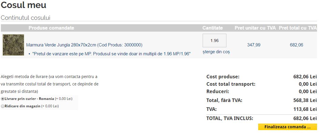 Dupa adaugarea fiecarui produs, esti directionat automat in cosul de cumparaturi, aici poti sa revezi lista produselor selectate, sa actualizezi cantitatea sau sa renunti la unul sau toate produsele selectate.