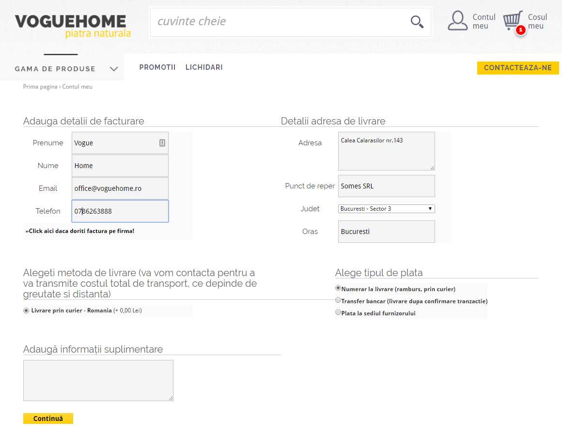 Dupa adaugarea produselor dorite in cos, trebuie sa selectezi detaliile de facturare, modalitatile de plata (Ramburs, Card Online, Rate) si modalitatea de livrare preferata (Ridicare de la Showroom, Ridicare de la punctele de livrare, Livrare la domiciliu);